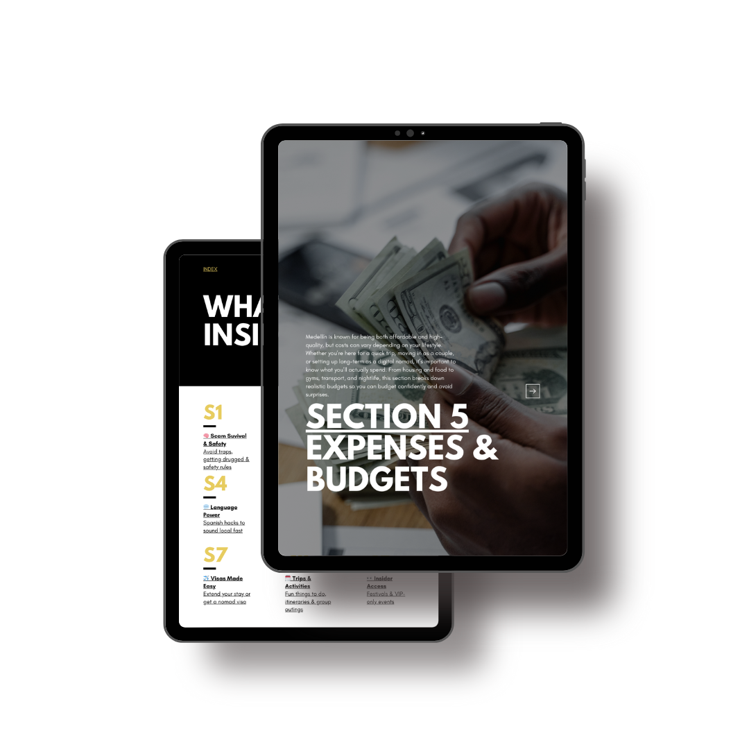 Medellín is known for being both affordable and high-quality, but costs can vary depending on your lifestyle. Whether you’re here for a quick trip, moving in as a couple, or setting up long-term as a digital nomad, it’s important to know what you’ll actually spend. From housing and food to gyms, transport, and nightlife, this part of the handbook breaks down realistic budgets so you can budget confidently and avoid surprises.